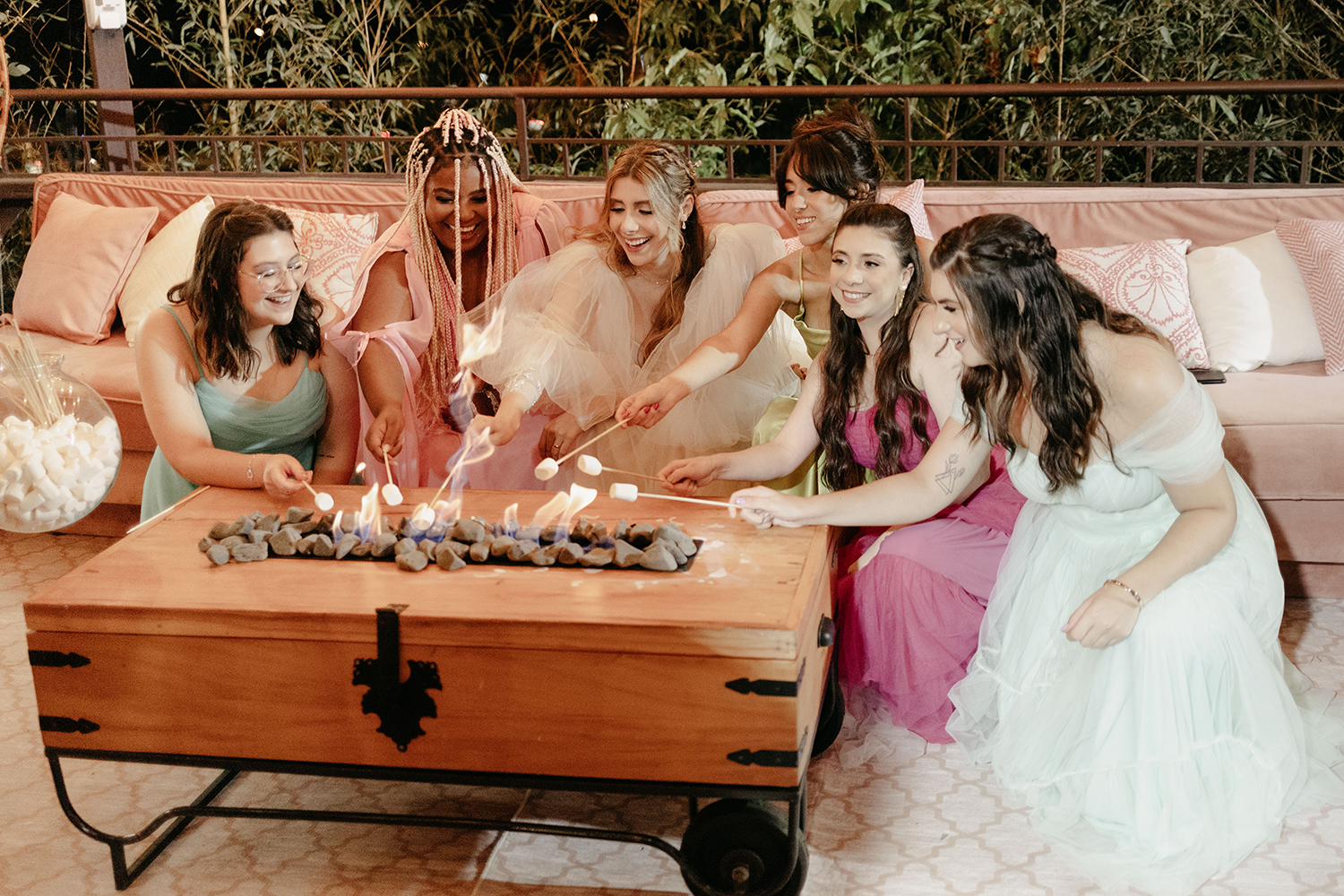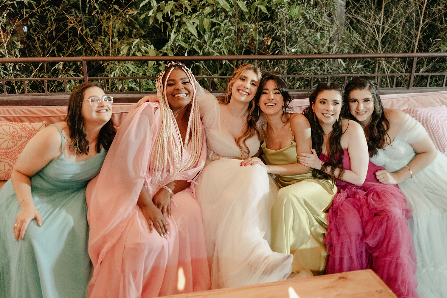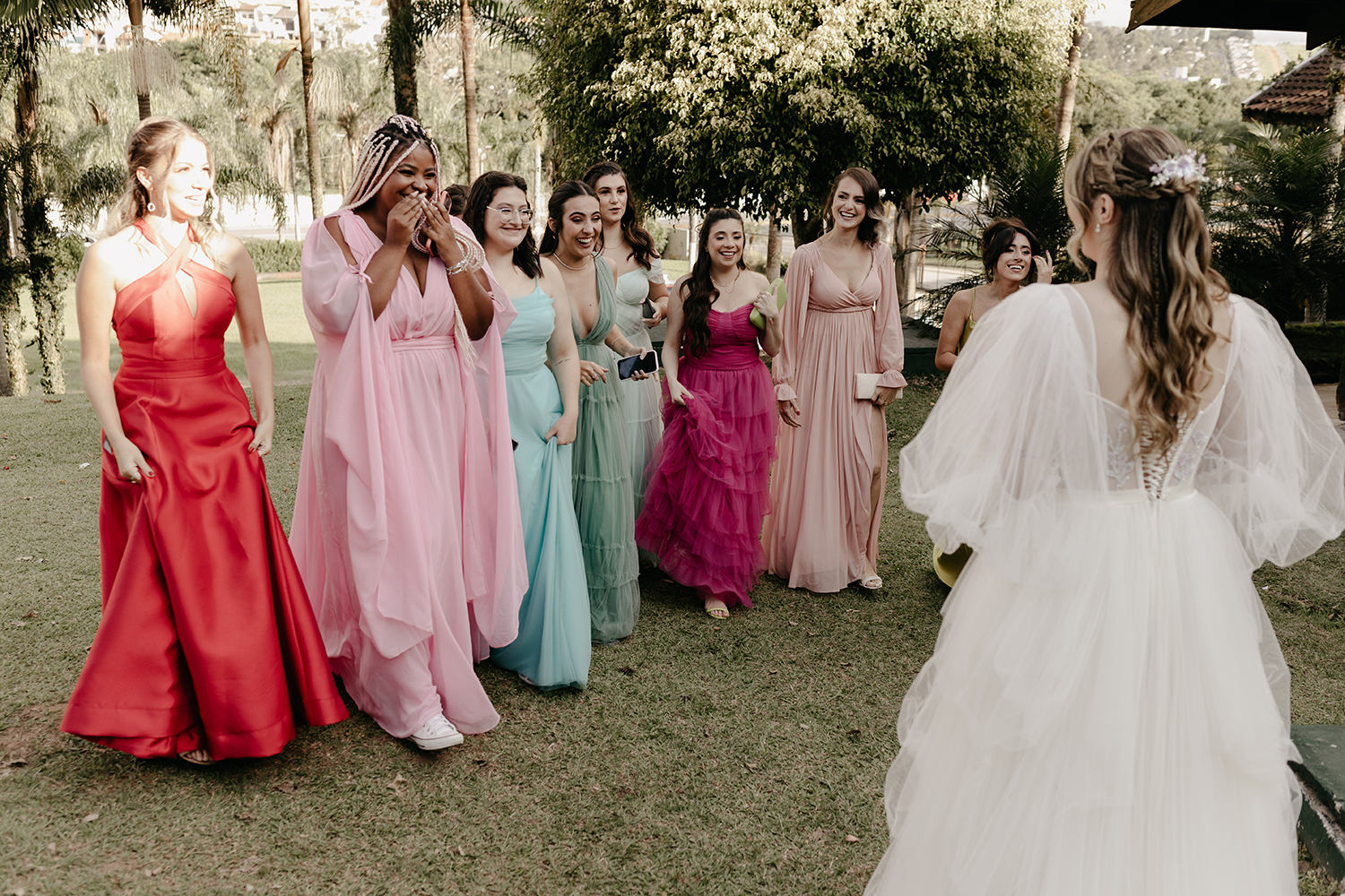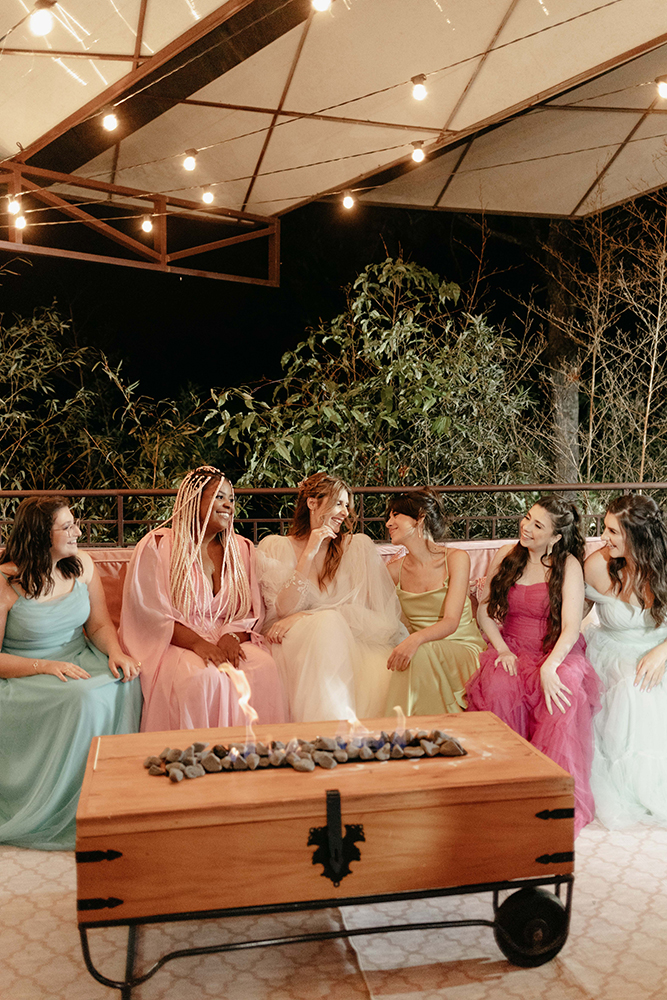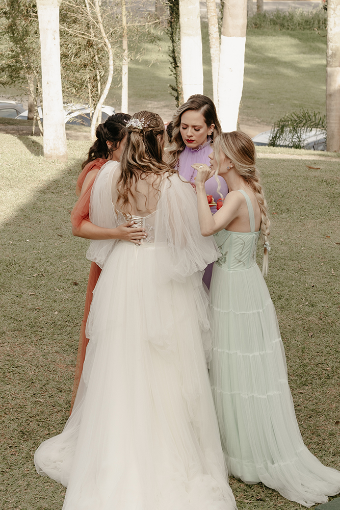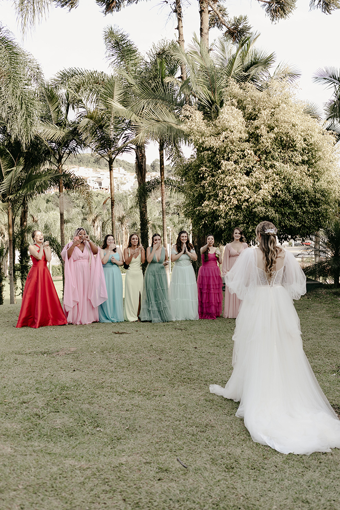 Eu, Stefanie, fiz muita questão de trazer todo esse universo da moda para o casamento. Dessa forma, escolhi a paleta de cores bem colorida para as damas e madrinhas. Sem contar o vestido confeccionado do zero com muitas informações de moda.