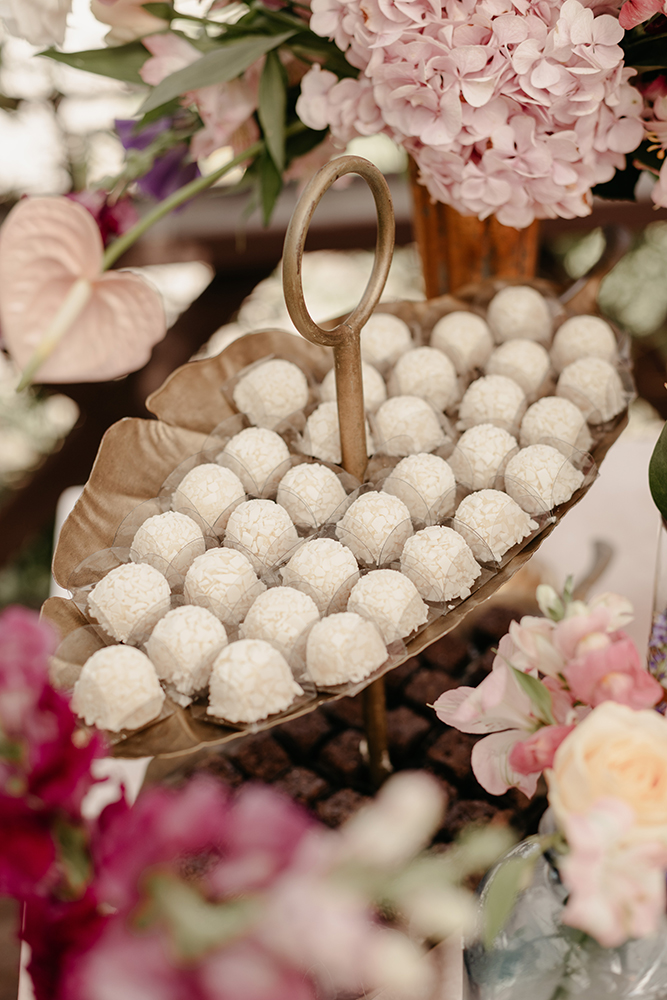 Na decoração quisemos explorar o rústico do local, o Sollar da Árvore, com a modernidade e criatividade. Então tivemos muita cor, flores, velas de formatos diferentes, toalhas de veludo e outros itens para sair da zona de conforto.