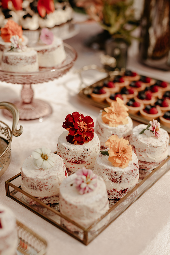 Não queríamos os tradicionais doces finos, então optamos por doces maiores e divertidos, como mini bolos, cupcakes e tortinhas.