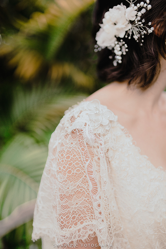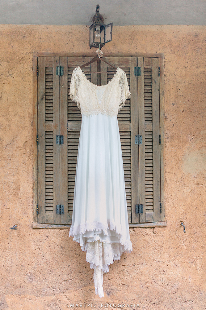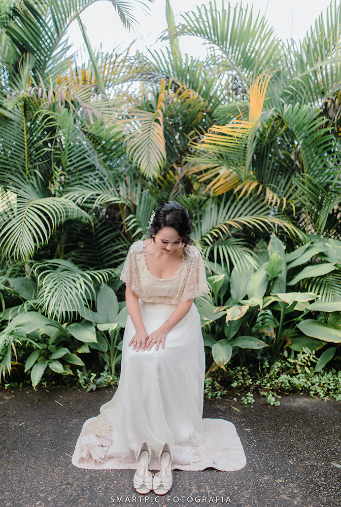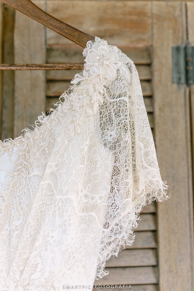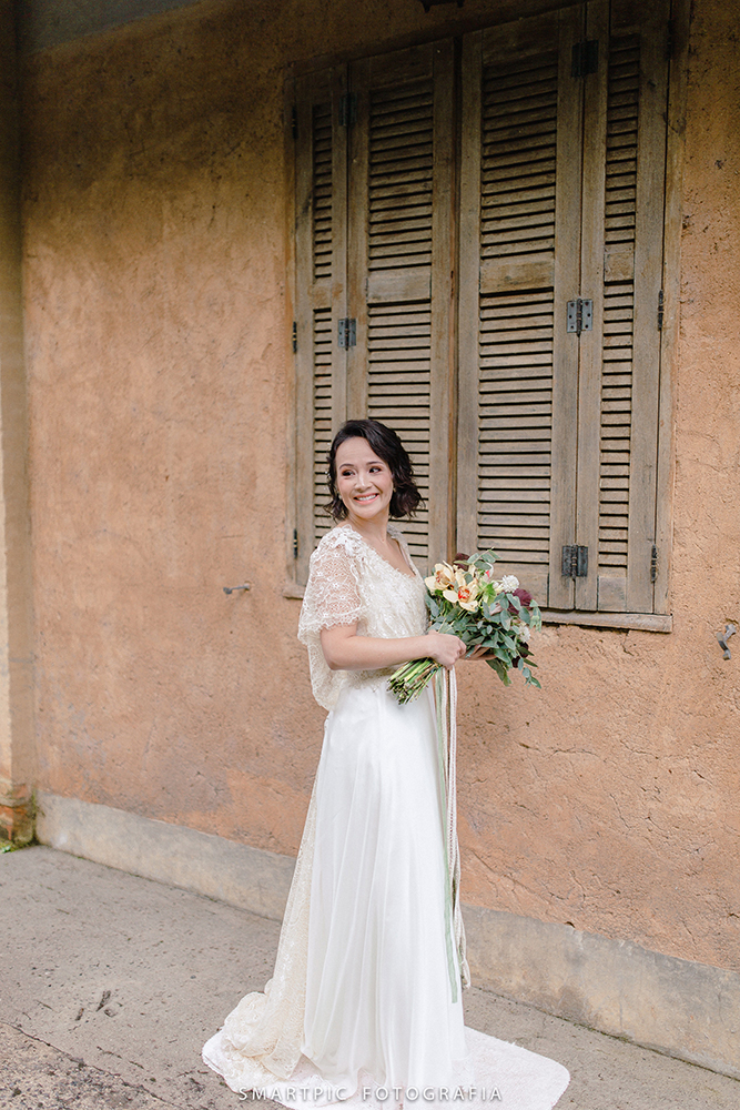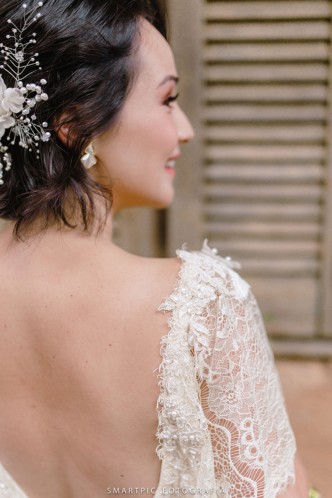 Leve e esbanjando felicidade, a noiva usou um vestido delicado, obra da querida Camila Machado, estilista da Lascivité.