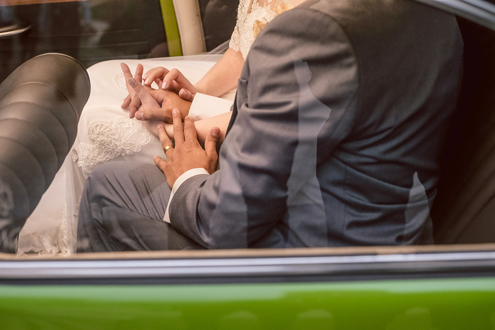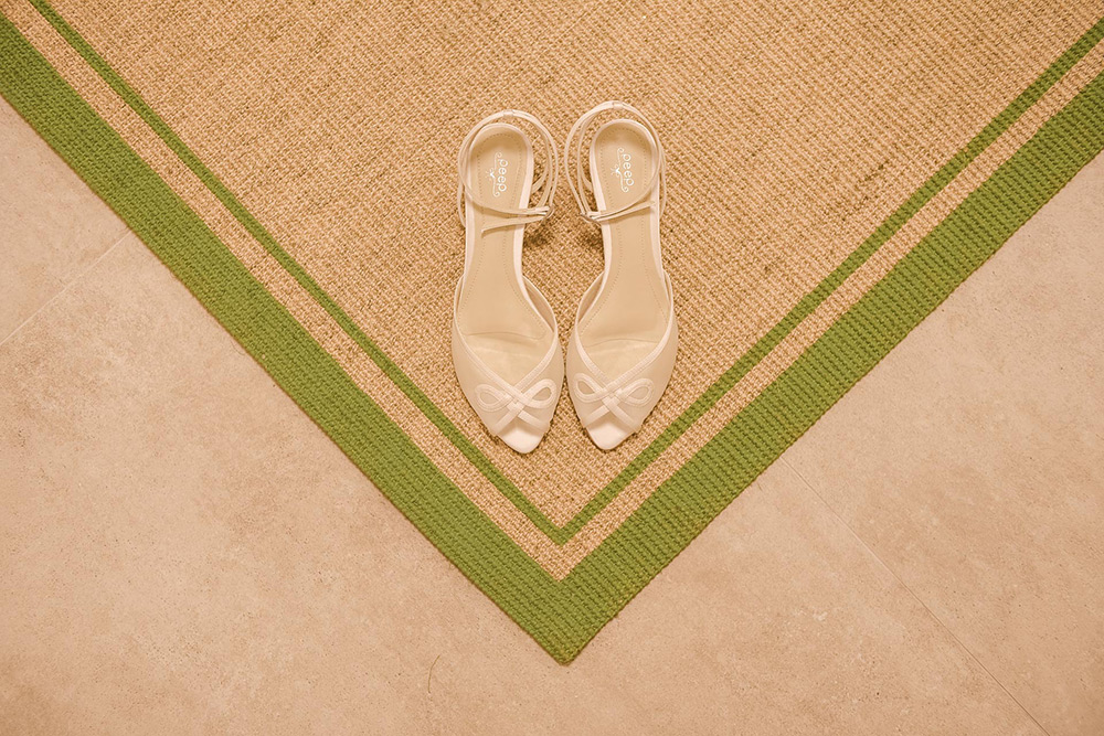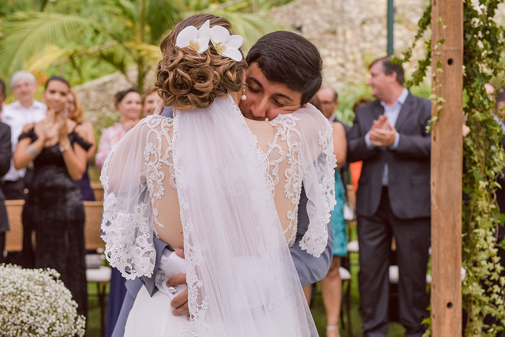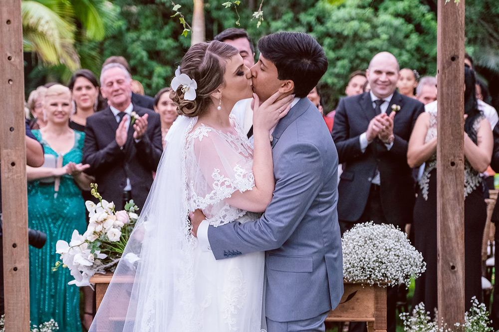 Como o espaço era aberto, fiquei dentro do Fusca com o meu primo (meu motorista no dia), em um local meio escondido, esperando os pais e padrinhos entrarem na cerimônia e pude ver um pedacinho e ouvir todas as músicas. Impossível descrever o que eu sentia e o frio na barriga que me deu. E então tudo aconteceu. Nós estávamos muito felizes, queríamos curtir cada detalhe. A cerimônia foi tão leve e descontraída que eu ri na hora dos votos!