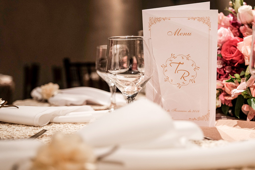 O restante das coisas conseguimos adaptar, por exemplo: eu trabalho com comunicação, então sempre precisei fazer layout no meu dia a dia, no casamento não foi diferente, desde o save the date, convite, cardápio e toda a papelaria foi pensada e desenvolvida por nós.