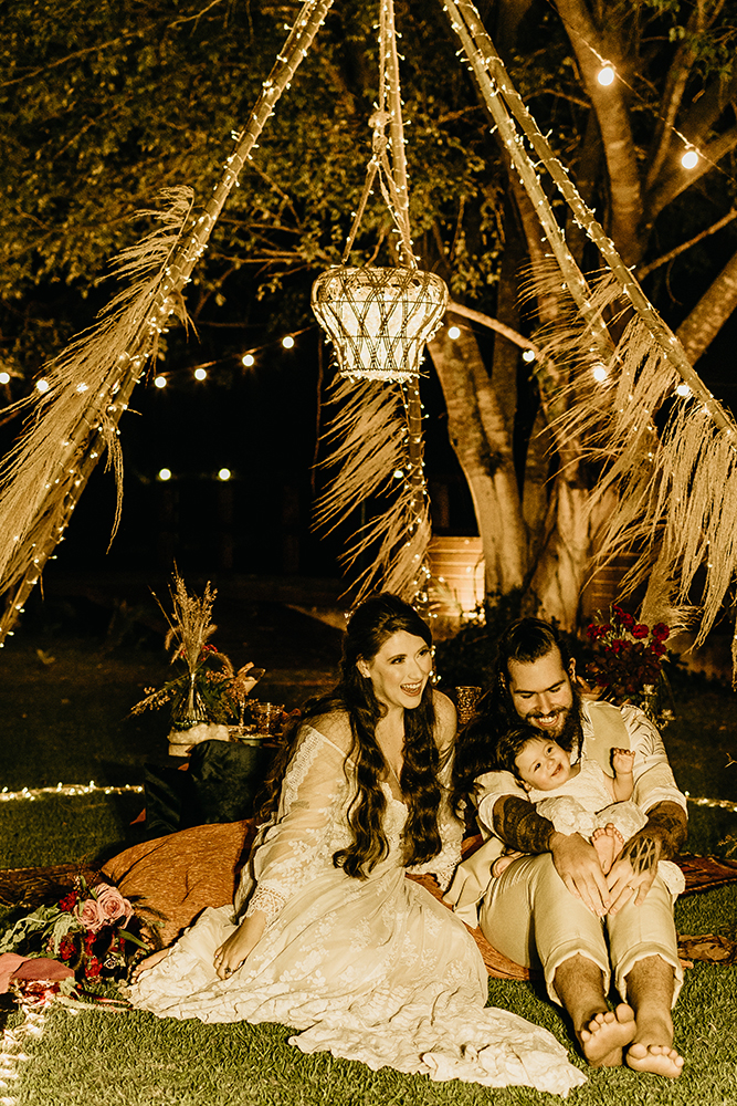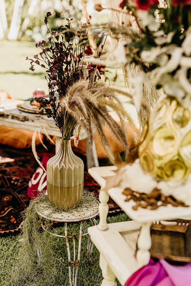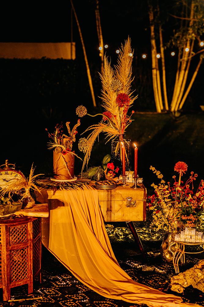 Em primeiro lugar, a decor assinada por Zayra d’Julio misturou o melhor do hippie e do rústico, destacando trabalhos artesanais, tons terrosos e cores marcantes. Tudo com muitas flores e folhagens secas.