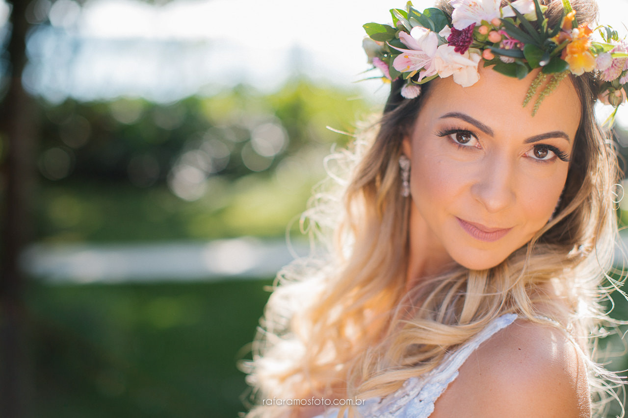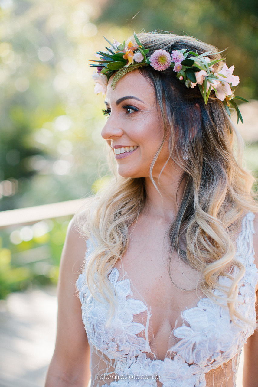 Vera optou por coroa de flores na cerimônia e um arranjo com cabelo semi preso na festa. Ficou linda!