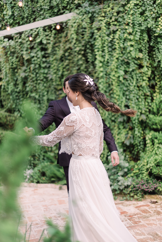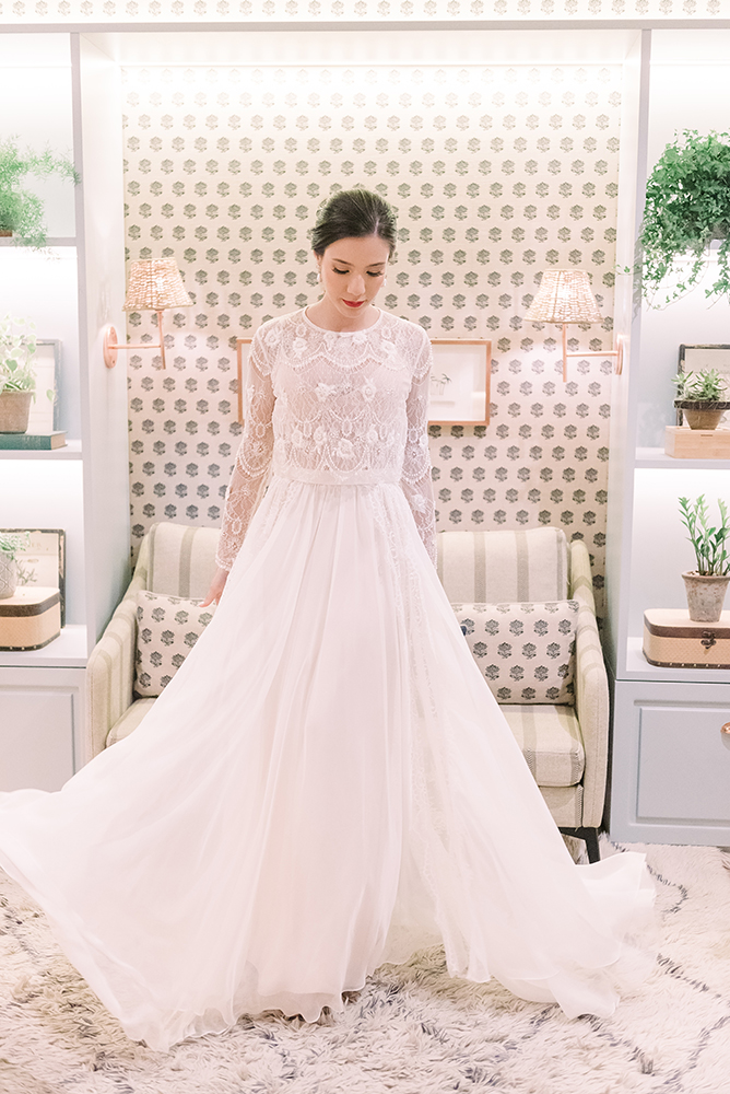 Em seguida, um lindo vestido sob medida. Ou melhor, saia e cropped, outra trend para quem vai casar este ano.