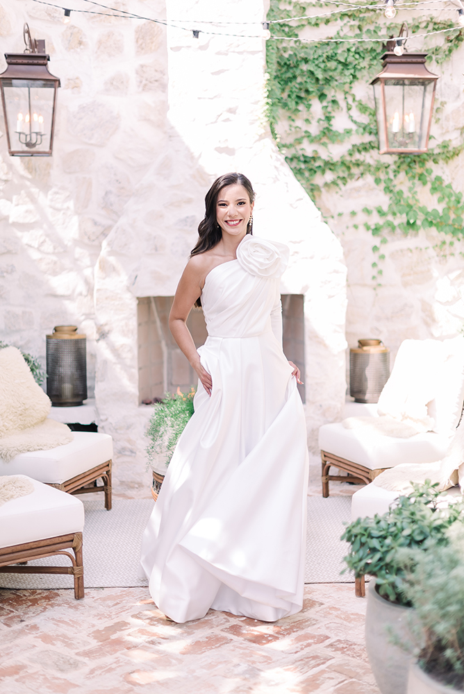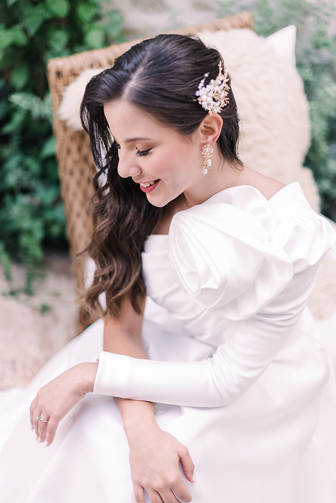 O primeiro vestido, da Paris 8, é a personificação da princesa minimalista. O modelo com decote assimétrico e uma grande flor em tecido tem tudo a ver com algumas das principais tendências para noivas em 2023.