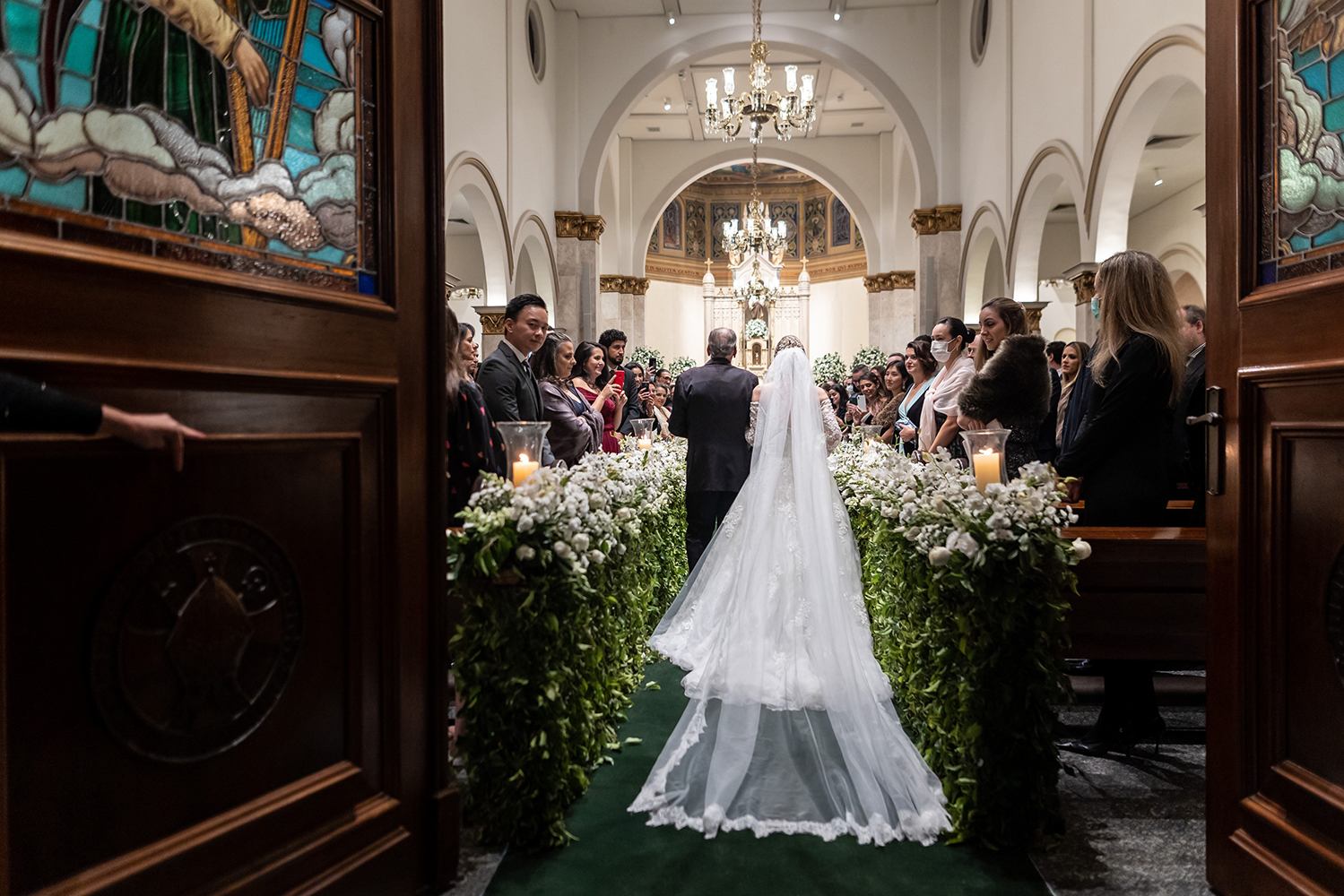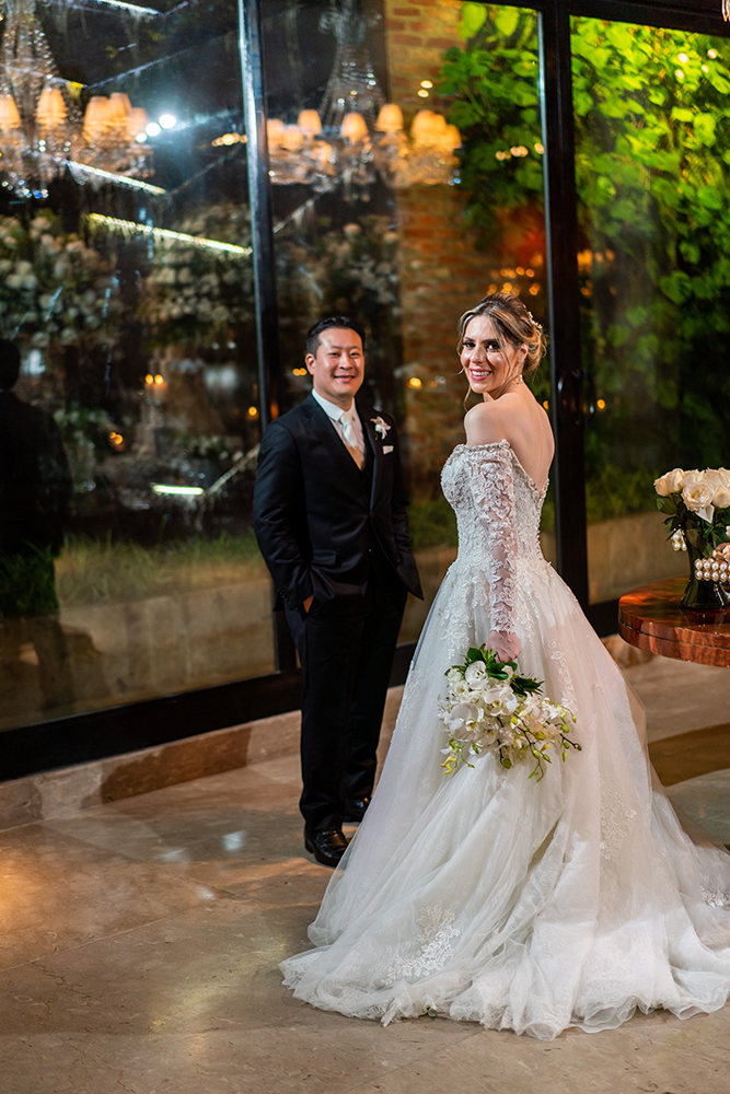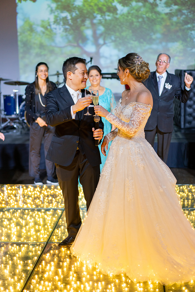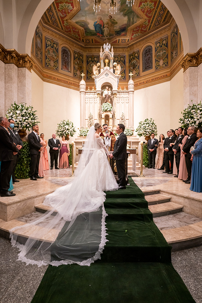 O casamento religioso estava inicialmente marcado para 2021, mas por causa da pandemia teve que ser adiado para junho de 2022. Olhando para o lado positivo, esse tempo a mais permitiu que os detalhes do casamento fossem melhorados, como a decoração. Foram colocados balões de led na saída da igreja, sparkles na festa e um espaço lounge próximo da mesa do bolo. Além das atrações musicais – walking sax na recepção, voz e violão no jantar, banda, dj e tambores de led.