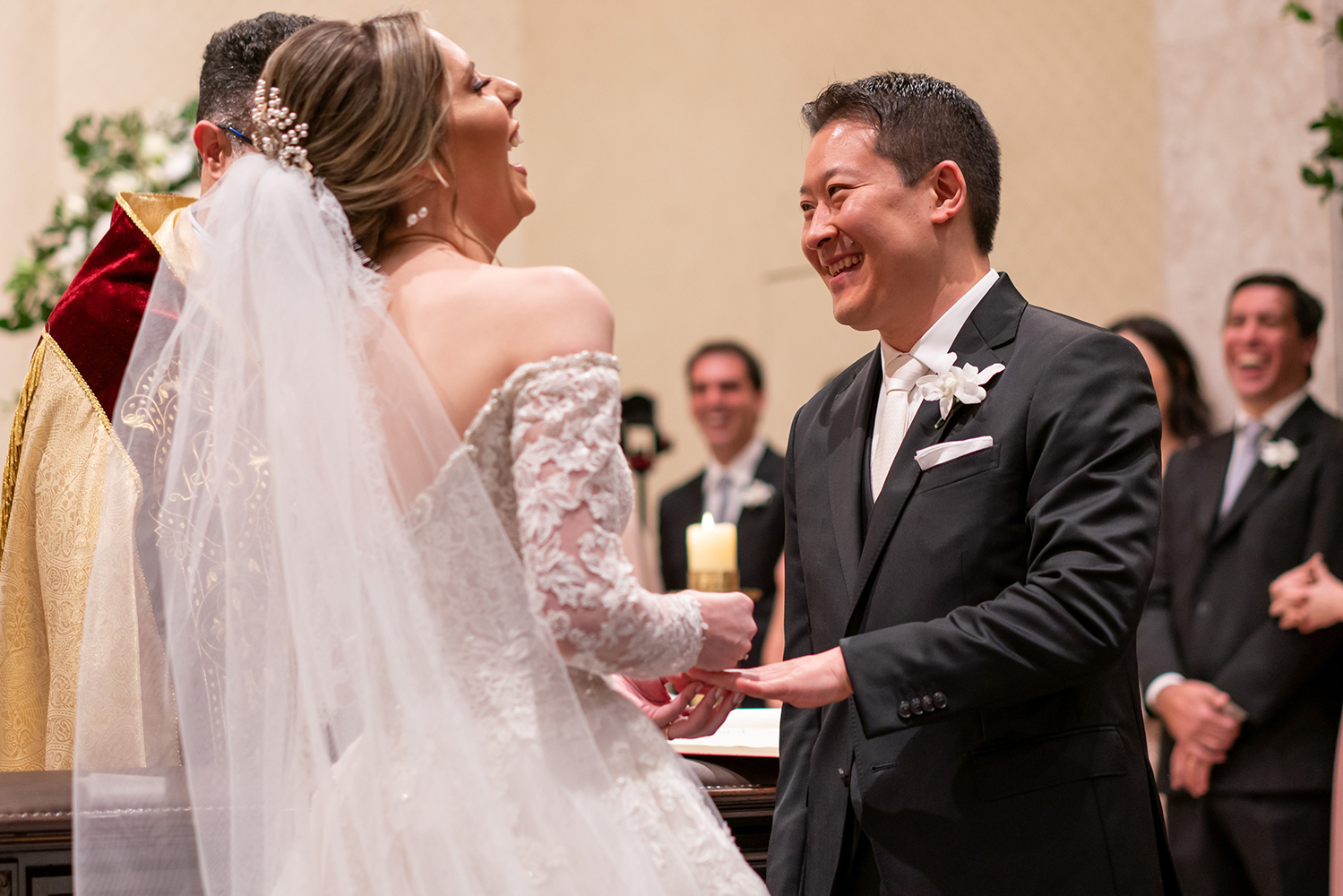 Ao casal, Viviane e Marco, nossos votos de uma vida plena, linda e feliz, tão vibrante quanto o enlace na igreja.