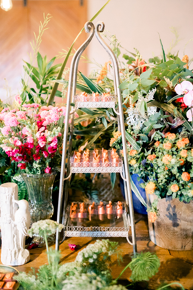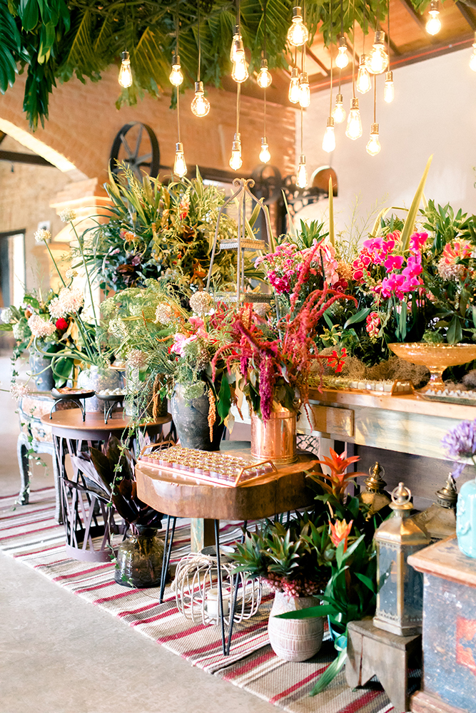 Bar, cenários instagramáveis, arranjos coloridos e uma super mesa de doces em 360° completaram o clima da festa. Reparem na beleza e mescla de texturas… Ficou perfeito!